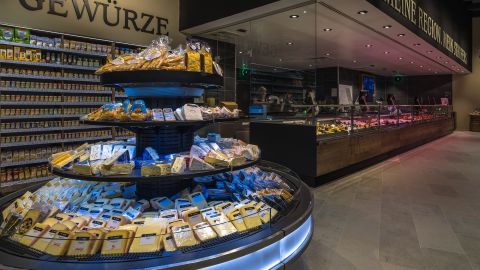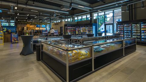 Die Architektur des Gebäudes verbindet funktionale Klarheit mit einer natürlichen, ortsbezogenen Materialität. Die Fassade aus vertikal strukturierten Weißtannenleisten verleiht dem massiven Baukörper eine feingliedrige, moderne Erscheinung. Das auskragende Vordach zeigt sich in Richtung Göppinger Straße und markiert zusammen mit den filigranen Rundstützen aus Stahl die adressbildende Gebäudeseite. Der Zugang für Markt, Kreissparkasse und Gastronomie ist geschützt unter diesem überdachten Außenbereich platziert - ergänzt durch Fahrradstellplätze und Sitzmöglichkeiten. Auch im Inneren wird das Gebäude seinem offenen Charakter gerecht: Eine großzügige Glasfassade empfängt die Besucher, der Zugang führt durch einen Windfang mit Leergutrücknahme in eine kleine Mall mit Backshop und weiteres gastronomisches Angebot mit einladend gestaltetem Sitzbereich. Der Verkaufsraum selbst folgt einem klaren Ablauf - beginnend mit Obst und Gemüse, weiter zur Frischetheke mit Schaubereich und angrenzenden Funktionszonen.