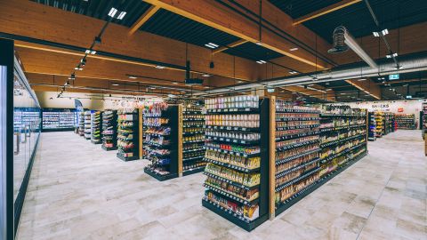 Der Markt wird an zwei Seiten von einem großzügigen Vordach umfasst. Darunter befinden sich der Eingang zum Markt, der Zugang zu einem separaten Windfang für die Leergutannahme, ein gastronomisch genutzter Sitzbereich, sowie Fahrradstellplätze. Betritt man den Markt, gelangt man über den Windfang in die Mall mit einem Backshop. Ihm ist ein dank einer großzügigen Verglasung einladend gestalteter Sitzbereich angegliedert. Der Verkaufsraum bietet den Kunden ein Einkaufserlebnis für alle Sinne. Man betritt direkt zu Beginn die Obst- und Gemüseabteilung und gelangt dann durch das Sortiment bis zur Frischetheke mit Schaubereich im hinteren Teil des Marktes. Dahinter befinden sich die Nebenflächen des Metzgers, das Lager, die Personal- und Technik-Räume, sowie der Anlieferbereich. Die Nebenflächen bilden zusammen mit dem Vordach eine Spange, die den höheren Hauptbaukörper an drei Seiten umfasst.