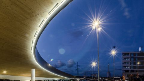 Durch einen im Vorfeld durchgeführten Wettbewerb hat die Stadt Ludwigsburg eine hochwertige Gestaltung des Gebäudes, sowie ein attraktives Konzept für den Vollsortimentsmarkt an den Neckarterrassen sichergestellt. Das in Massivbauweise erstellte Hauptgebäude öffnet sich mit seiner großzügigen Verglasung zum Weinbergblick. Die vertikal und horizontal geschwungene und begrünte Dachlandschaft inklusive der auslaufenden Böschung zur Landesstraße schafft einen sanften Übergang zwischen der neuen Wohnbebauung am Weinbergblick und den Neckarwiesen im Nordwesten und stellt eine Interpretation der den Markt umgebenden Landschaft dar.Das gesamte Gründach spendet mit seiner dreiseitigen Auskragung angenehmen Schatten im Sommer und entsprechend guten Schutz bei schlechter Witterung. Das Dachtragwerk wurde in Holzbauweise ausgeführt, was neben dem positiven Erscheinungsbild die gelebte Nachhaltigkeit der Edeka-Südwest unterstreicht. Durch die offene Konstruktion wirkt der Markt hell und freundlich und vermittelt eine angenehme Großzügigkeit.
