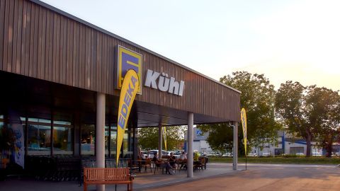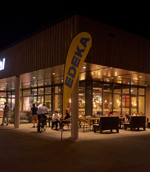 Mit dem Neubau des EDEKA-Marktes EDEKA Kühl entsteht ein prägnanter städtebaulicher Akzent und ein moderner Ort der Nahversorgung. Der neue Markt ersetzt den bisherigen Bestandsbau und öffnet sich als funktionaler wie sozialer Mittelpunkt für die Gemeinde. Die klare, kompakte Bauform reagiert präzise auf das Grundstück und wurde im Zusammenspiel mit der gesamten Erschließung neu organisiert und dabei eine Querungshilfe und zwei Zufahrten geschaffen. Die Architektur des Gebäudes verbindet funktionale Klarheit mit einer natürlichen, ortsbezogenen Materialität. Eine Fassade aus vertikal strukturierten Weißtannenleisten verleiht dabei dem massiven Baukörper eine feingliedrige, moderne Erscheinung. Als Hommage an die Weinbautradition der Region wird die Fassade in Teilbereichen mit alten Weinreben begrünt. Es entsteht ein lebendiges Gestaltungselement, das den Bezug zu Ihringen als bekannte Weinbaugemeinde im Kaiserstuhl unterstreicht. Das im Baukörper integrierte Vordach markiert gemeinsam mit Rundstützen aus Stahlbeton die adressbildenden Gebäudeseiten zur Straße hin. Der Haupteingang ist geschützt unter diesem überdachten Außenbereich platziert. Ergänzt wird dieser durch Sitzgelegenheiten. Auch im Inneren wird der offene Charakter des Gebäudes konsequent weitergeführt: Eine großzügige Glasfassade empfängt die Kundschaft. Der Zugang führt durch einen Windfang in eine kleine Mall mit Backshop und einem gastronomischen Angebot samt einladend gestaltetem Sitzbereich. Der Verkaufsraum selbst folgt einem klar strukturierten Ablauf, beginnend mit der Obst- und Gemüseabteilung, über die Frischetheke mit Schaubereich bis hin zu den angrenzenden Funktionszonen des Marktes. Die Raumabfolge ist auf Übersichtlichkeit, Kundenführung und Aufenthaltsqualität ausgelegt. Der Leergutabgabe befindet sich in einem separaten Windfang. Mit einem Effizienzgebäude-Standard 40 EE und einem Anteil von 70% erneuerbarer Energien leistet der Neubau einen aktiven Beitrag zum Klimaschutz. Eine extensive Dachbegrünung, eine großflächige Photovoltaikanlage, moderne LED-Technik sowie der Einsatz regenerativer Energien durch Wärmepumpen und eine thermodynamische Anlage machen den Markt unabhängig von fossilen Energieträgern. Für Elektrofahrzeuge gibt es mehrere Ladestationen.