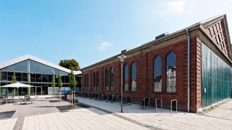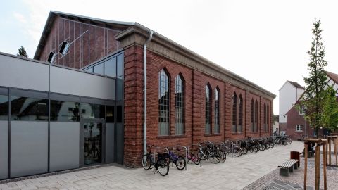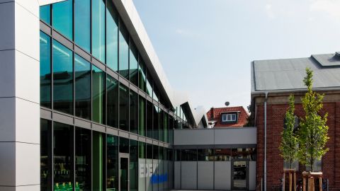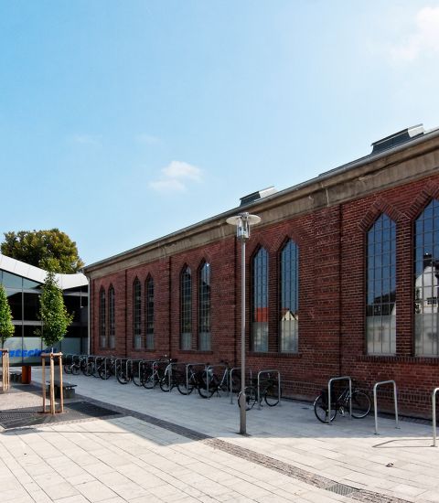 Nach Wegfall der Straßenbahnwendeschleife und Verlegung der Gleichrichterstation eröffnete sich im historischen Zentrum von Arheilgen die Möglichkeit, das gesamte Umfeld des denkmalgeschützten "Goldnen Löwen" neu zu gestalten. In diesem Kontext wurde über einen Wettbewerb geprüft, wie sich ein Vollversorgermarkt samt erforderlichen Stellplätzen städtebaulich verträglich am besten in den Ortskern einbinden lässt. Die Herausforderung war zudem die denkmalgeschützte HEAG-Halle in das Marktensemble zu integrieren. Als Ergebnis unserer Überlegungen entstand ein Ensemble, das mittels gefalteter Gebäudehülle und transparenter Fassade sowie sanften Übergängen zur angrenzenden Umgebungsbebauung an die Bestandshalle andockt, womit wir die Jury von der Realisierbarkeit überzeugen konnten.