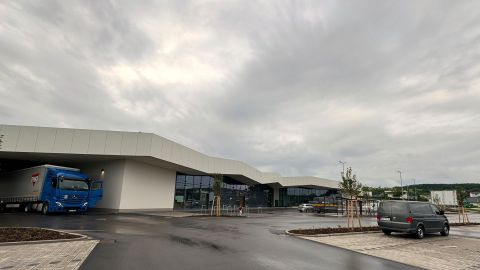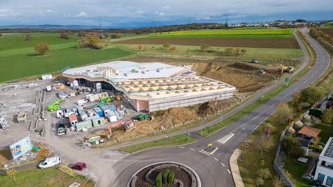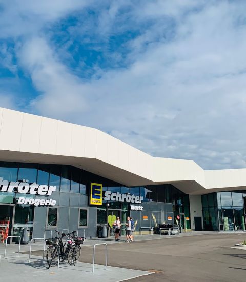 Über den Kreisverkehr der Iptinger Straße gelangt man auf die Stellplatzanlage mit ca. 178 Stellplätzen. Die großzügige Glasfassade im Eingangsbereich lädt den Kunden zum Einkauf ein, der Backshop mit Sitzplätzen im Innen- und Außenbereich zum Verweilen und Genießen. Das Gebäude wurde in Massivbauweise erstellt. Gedämmte Stahlbetonstützen und der Einsatz von Mauerwerk sichern die erforderlichen Werte für ein Effizienzgebäude 40EE. Bei der Dachkonstruktion kamen Brettschichtholzbinder zum Einsatz. Sie sorgen im Innenbereich für eine warme und gemütliche Atmosphäre. Das begrünte Dach wurde zudem mit einer PV-Anlage ausgestattet.