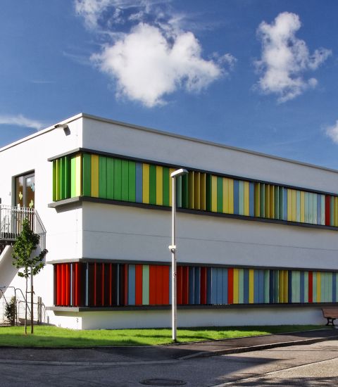 „Durch den Neubau ist das Gebäude klar als Kindergarten identifizierbar. Die bunte Fassade, die anfangs nicht ganz unumstritten war, kommt sowohl bei den großen wie kleinen Nutzern des Gebäudes sehr gut an." - Thomas Braun, Architekt