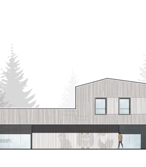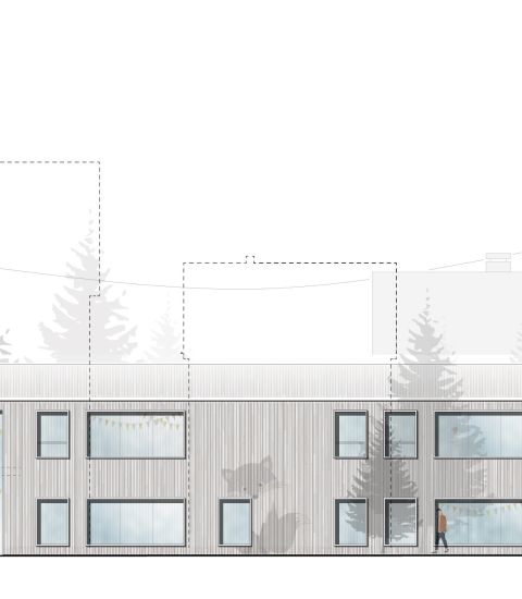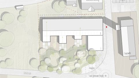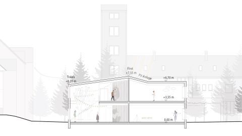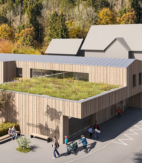 Der Neubau des Kindergartens in Ramsbach soll den Kindern ein besonderes Erlebnis bieten. Inspiriert von der Umgebung, ist der Kindergarten wie ein Dorf aufgebaut: Er wird von Wegen durchzogen, die sich zu Durchgängen verengen, Nischen bilden und sich zu einem zentralen Raum wieder öffnen - in einer kindgerechten Maßstäblichkeit. Außerdem spielt die Nähe zum Wald eine bedeutende Rolle. Durch den Einsatz verschiedener Holzmaterialien wird eine gemütliche und warme Atmosphäre erzeugt.