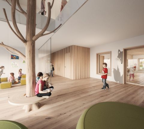 Es gibt drei unterschiedliche funktionale Bereiche: den Infrastrukturraum, den Gemeinschaftsbereich und die Gruppenräume. Sie sind über einen bandartigen Bewegungsraum miteinander verknüpft, der den Kindern verschiedene Spielmöglichkeiten bietet. An diesen Raum schließen direkt die Gruppenräume an. Sie werden von drei Seiten belichtet und haben einen direkten Zugang zum Außenbereich und somit eine direkte Verbindung zum Landschaftsraum. Auch hier bieten sich vielfältige Möglichkeiten zum Spielen und Entdecken, darunter ein Erlebnisparcours. Zudem wird der angrenzende öffentliche Raum umgestaltet, um die zentrale Bedeutung des Kindergartens im Dorf zu betonen und mit den öffentlichen Gebäuden zu verbinden.