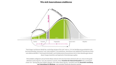 Unser Konzept für das Kreativquartier Schlachthof Offenburg basiert auf der Theorie des „Crossing the Chasm“, die den Übergang von frühen Innovatoren zu einer breiten Nutzerbasis beschreibt. Im Gegensatz zu traditionellen Kreativwirtschaftszentren, die häufig isolierte Räume für „Kreative“ schaffen, wollen wir ein dynamisches Ökosystem etablieren. Ziel ist es, Innovationen langfristig in Offenburg zu verankern, sodass Unternehmen in der Region bleiben und wachsen.