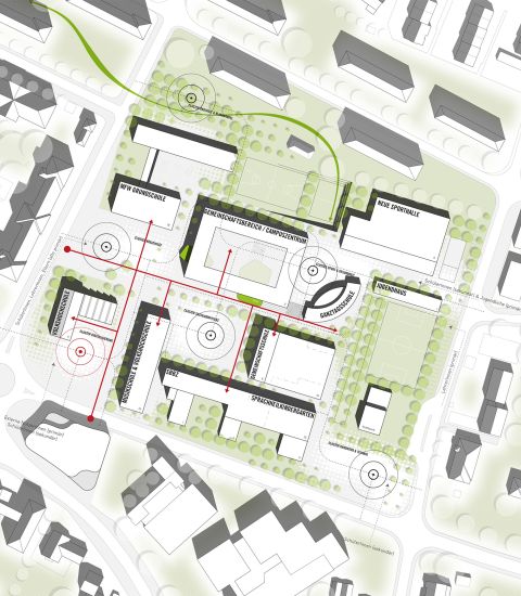 Der Schulcampus Müllheim soll zukunftsfähig gestaltet werden, indem zwei sich überlagernde Systeme eingeführt werden. System 1 basiert auf der institutionellen Bildung, die Struktur, Halt und Identifikation bietet, mit resilienten, einfachen Baukörpern. System 2 fördert offenes, selbstorganisiertes Lernen, indem es themenorientierte Wissenscluster auf einem flexiblen Grundraster ermöglicht, die Kollektivwissen generieren und die Stadtgesellschaft einbinden. Das Ziel ist eine urbane Wissenslandschaft, in der Themen statt Institutionen im Mittelpunkt stehen, flexibel auf Veränderungen reagiert werden kann und der Campus als integraler Teil der Stadt wahrgenommen wird.