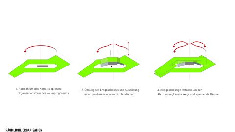 Der zweite wesentliche Faktor ist die komplexe Grundstücksgeometrie. Die dreieckige Form des Areals macht eine klare Ausrichtung schwierig, die maßgeblichen Achsen des Kontextes machen eine städtebauliche Integration schwierig. Als Reaktion darauf schreiben wir unserem Gebäudekörper eine Drehung, einen “Twist” ein. Dadurch sind wir in der Lage auf der Erdgeschossebene anders zu reagieren als in den Obergeschossen.